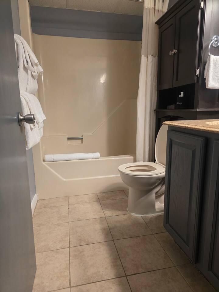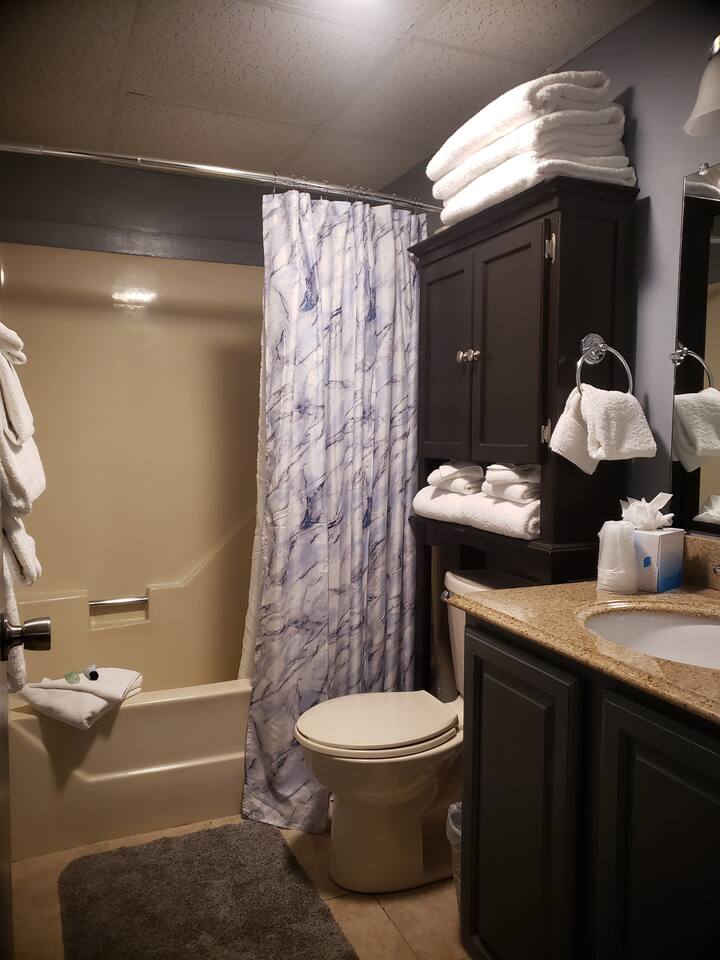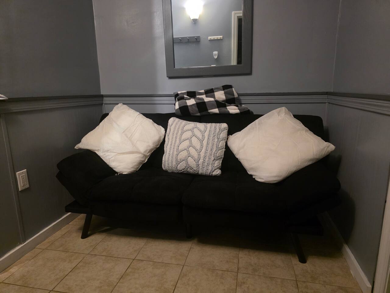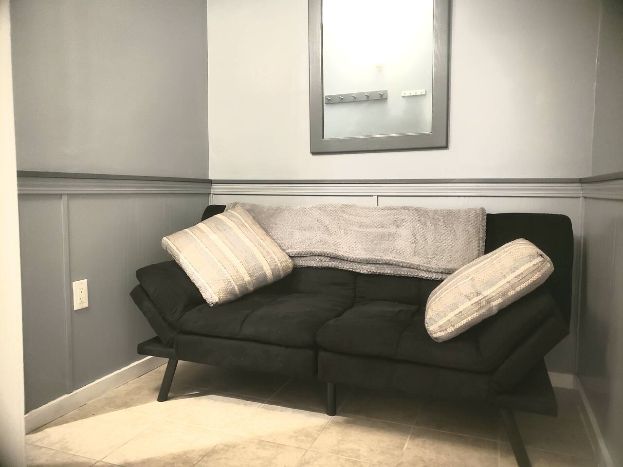 Once in the building take the hallway to the right and the condo #5H will be on the left. Once in the condo, the bathroom is immediately to the left. The Twin futon bed to the right behind the door. Straight forward you will enter the open floor plan with the kitchen and bedroom with full size bed. The sliding door at the far end, past the bed will go out the back of the building to the patio. If you need or want bigger bed sizes, look at our 5R condo.