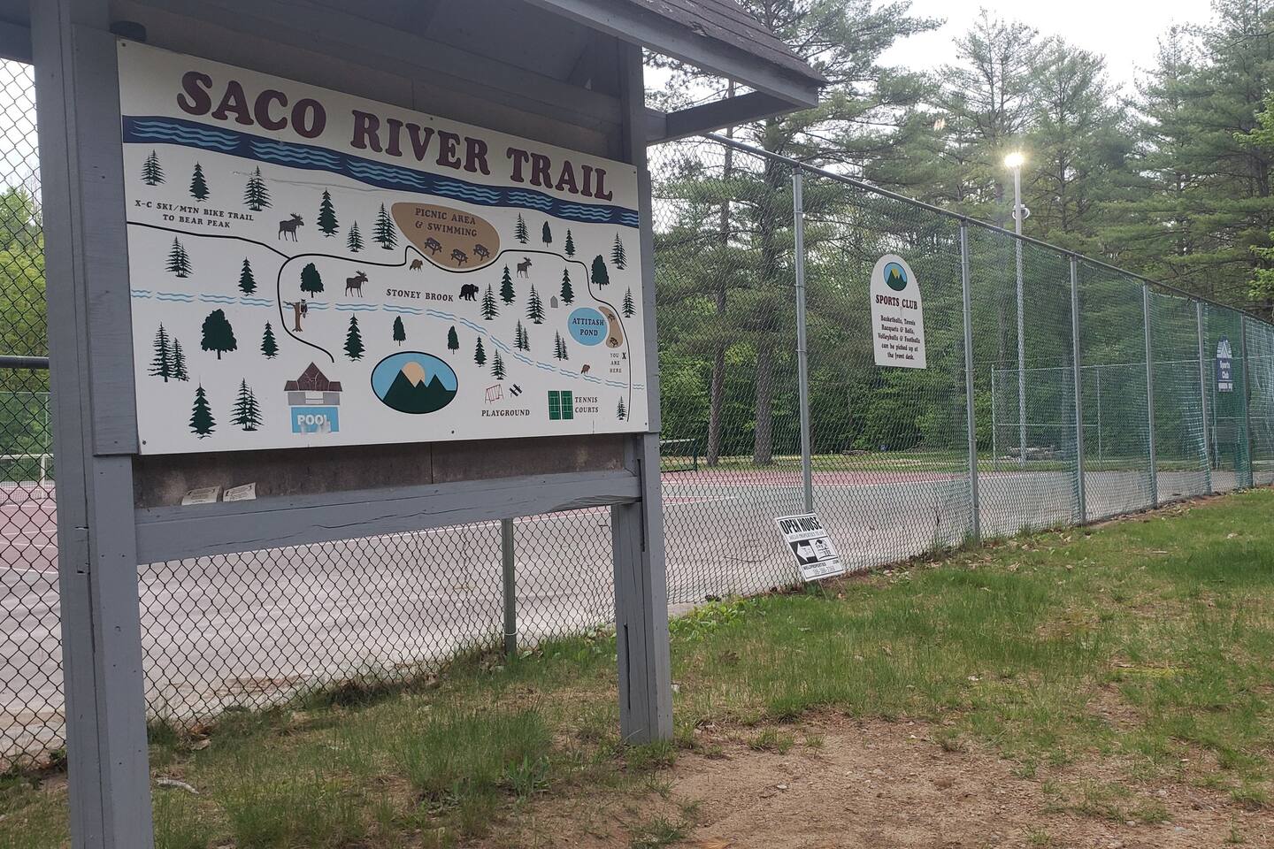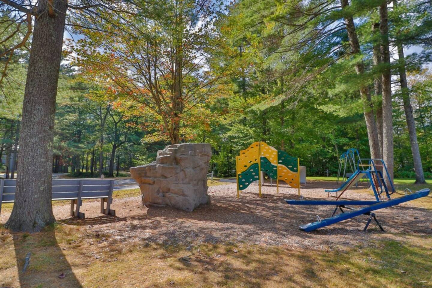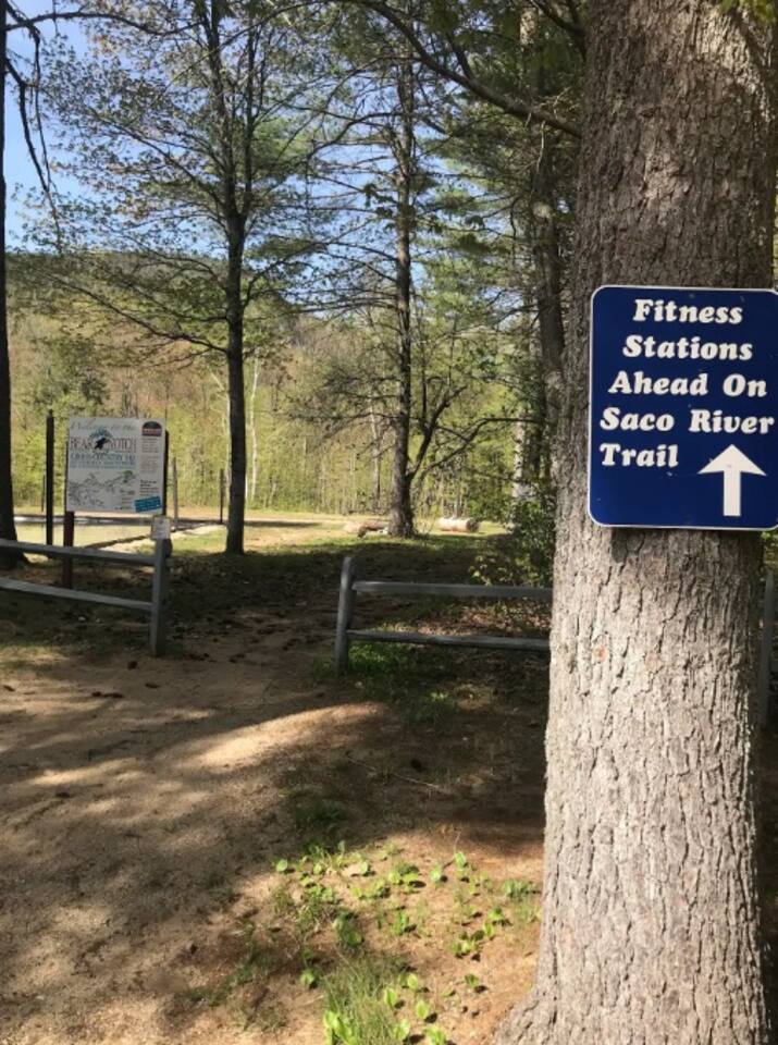 Its a second floor condo. You walk into the living room with the open floor plan, queen size sleeper couch and the kitchen to the right. The bathroom is off of this main living area located next to the entry. Turning left from entry is the bedroom with a king size bed and vaulted ceilings. Views are of the playground/tennis area at the back of the resort. Its through that area that you would walk to get to the on site walking paths and Saco River.