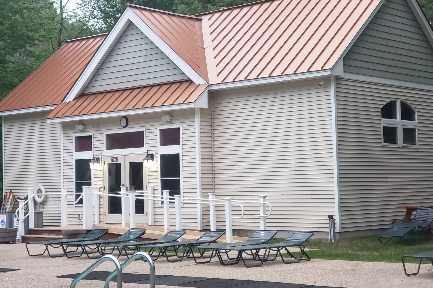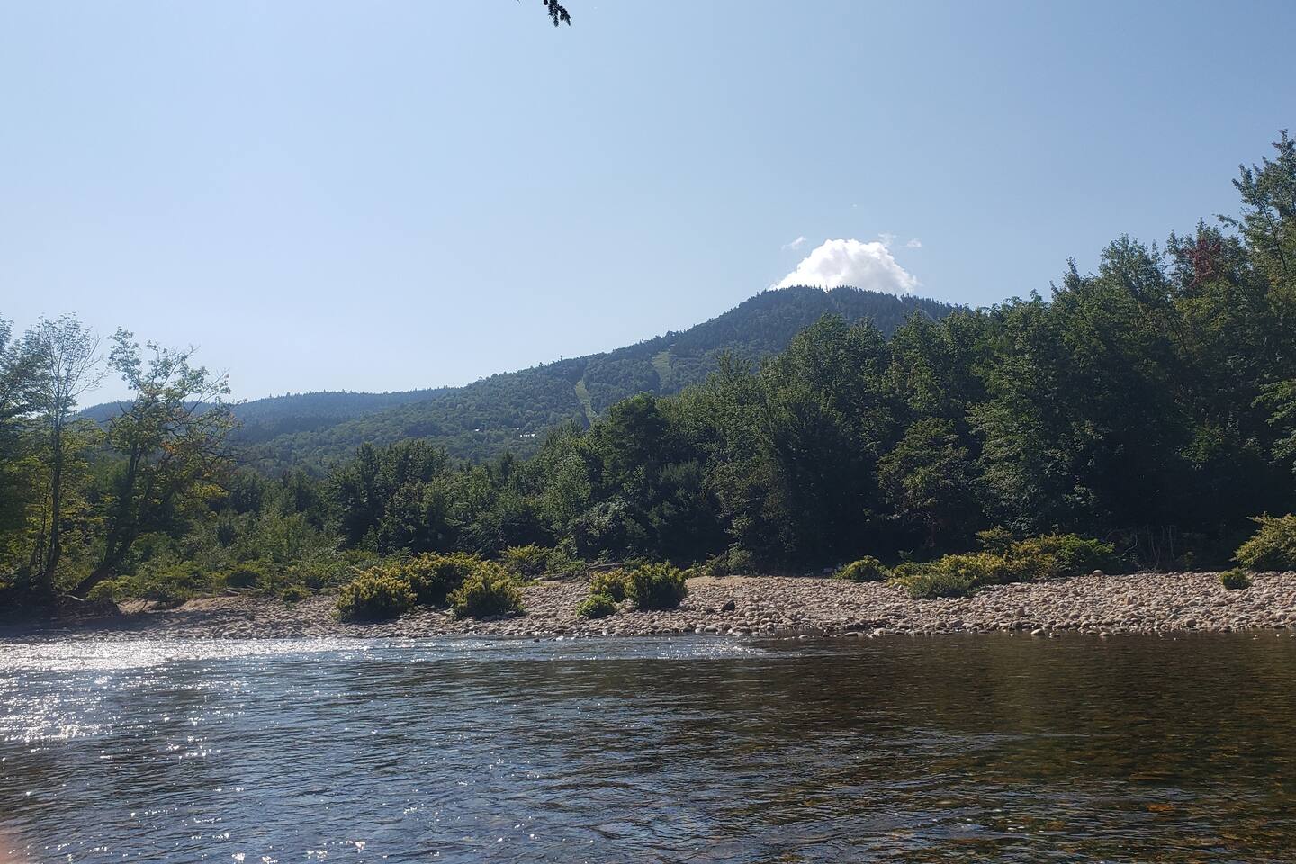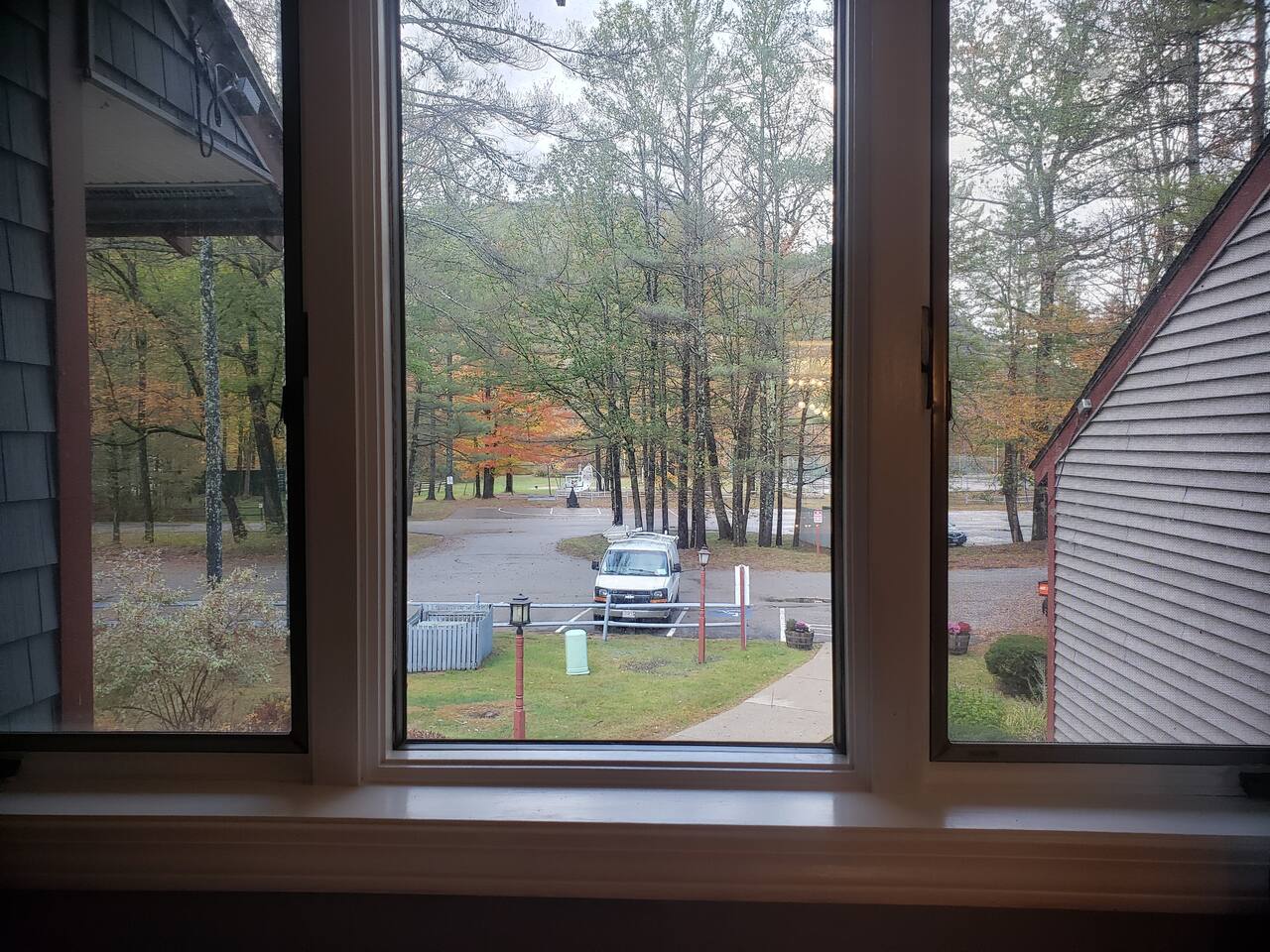 Its a second floor condo. You walk into the living room with the open floor plan, queen size sleeper couch and the kitchen to the right. The bathroom is off of this main living area located next to the entry. Turning left from entry is the bedroom with a king size bed and vaulted ceilings. Views are of the playground/tennis area at the back of the resort. Its through that area that you would walk to get to the on site walking paths and Saco River.