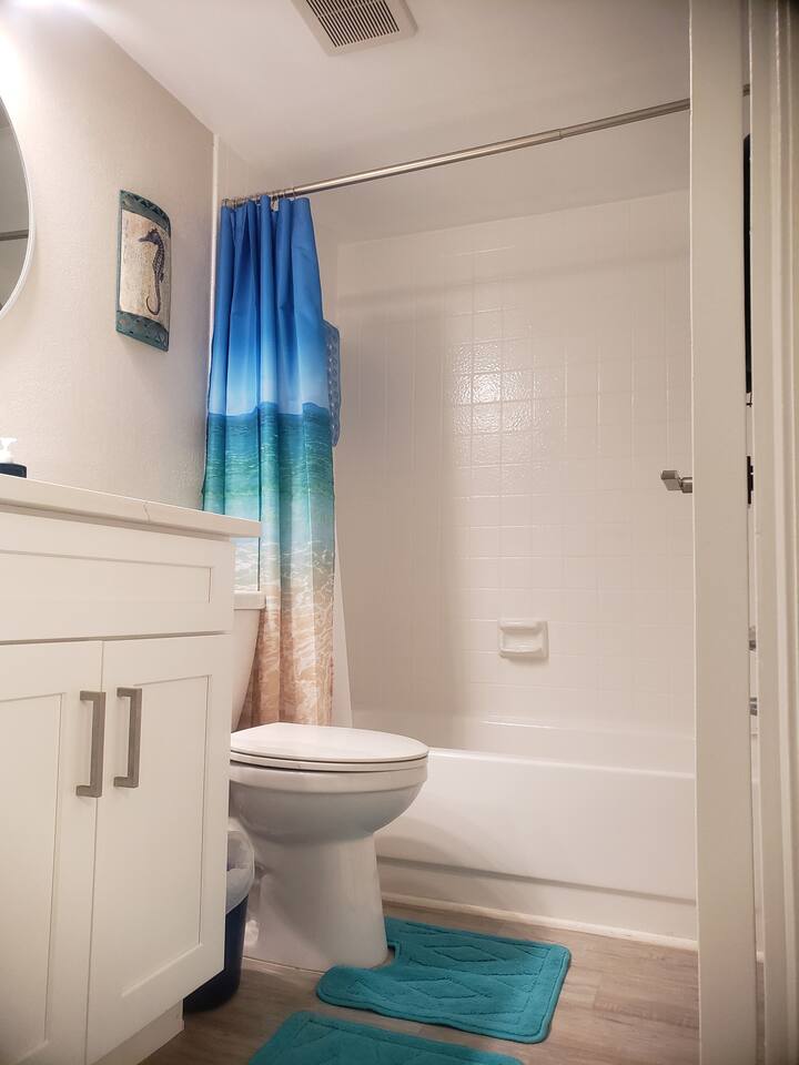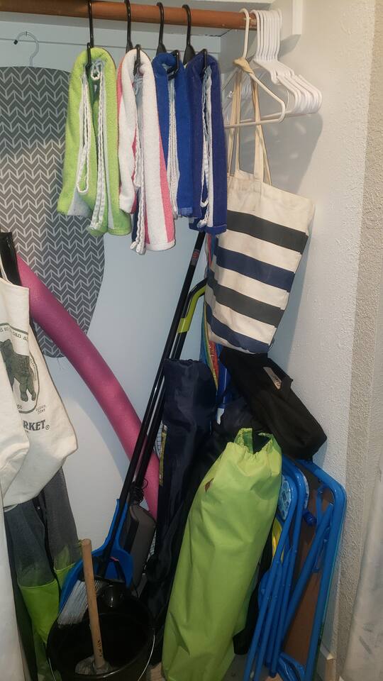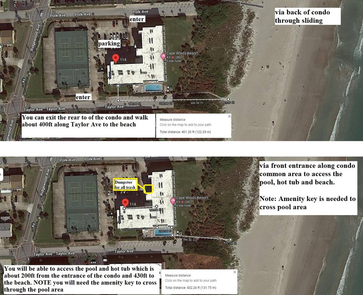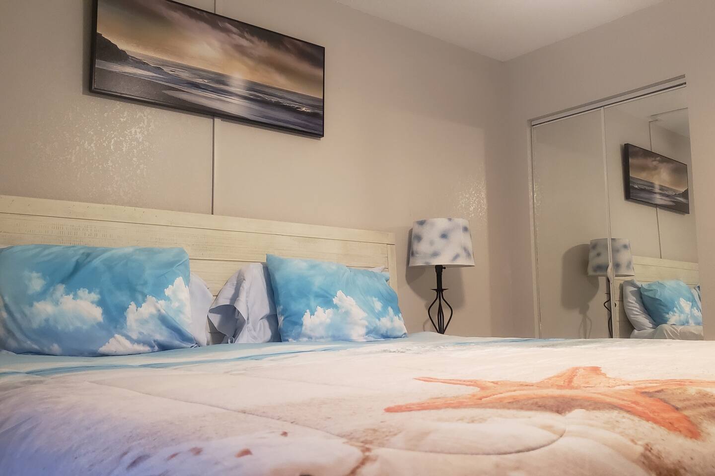 First floor condo with easy access to free parking (long term, handicap and quick load}, closest condo to Laundry all on one side. Through the door there is a bedroom (king size bed with 50" tv) to the left with a ensuite bathroom. Continuing forward, you'll find the full kitchen featuring full sized equipment and lots of countertop space. Beyond that you'll find within the open floor plan a spacious living room with queen size sleeper sofa, all leading to the sliding door and the patio. From the patio you have easy access to additional "public parking" and a few steps to the left is the hot tub, pool (keyed access) and beach. Pack n' Play "Play Yard / Play Pen" is located in closet with other assorted items.