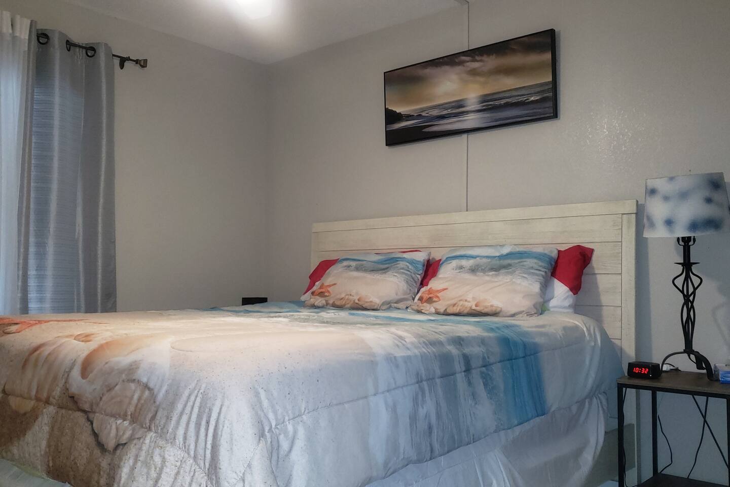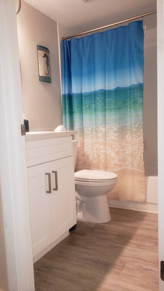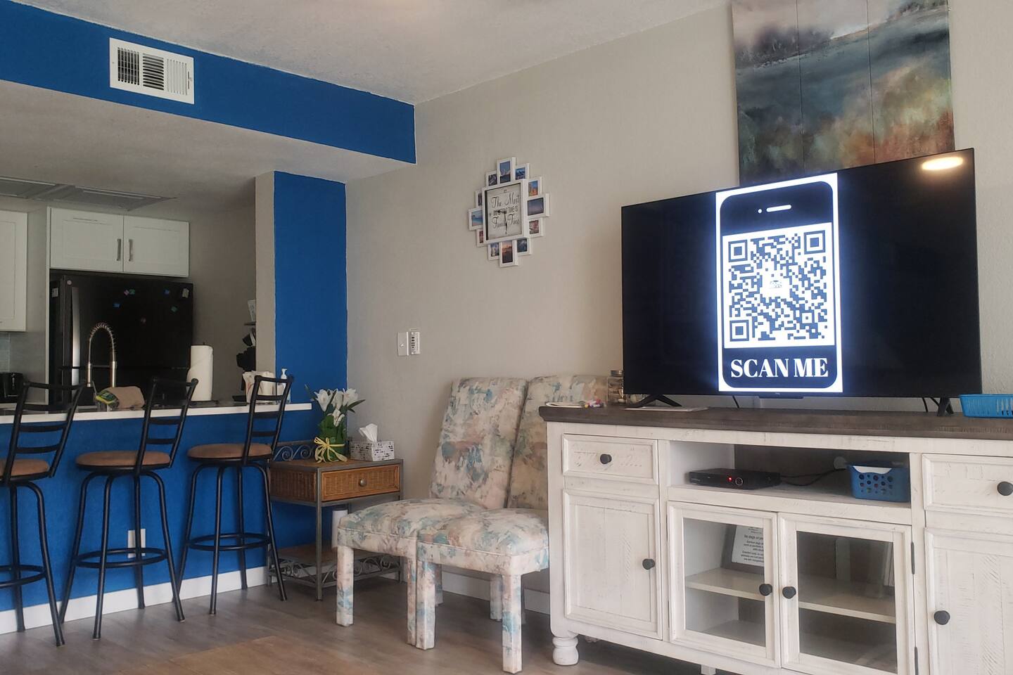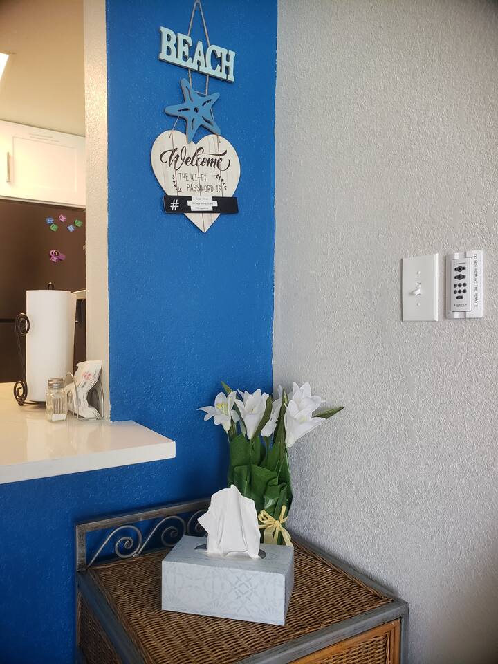 First floor condo with easy access to free parking (long term, handicap and quick load}, closest condo to Laundry all on one side. Through the door there is a bedroom (king size bed with 50" tv) to the left with a ensuite bathroom. Continuing forward, you'll find the full kitchen featuring full sized equipment and lots of countertop space. Beyond that you'll find within the open floor plan a spacious living room with queen size sleeper sofa, all leading to the sliding door and the patio. From the patio you have easy access to additional "public parking" and a few steps to the left is the hot tub, pool (keyed access) and beach. Pack n' Play "Play Yard / Play Pen" is located in closet with other assorted items.